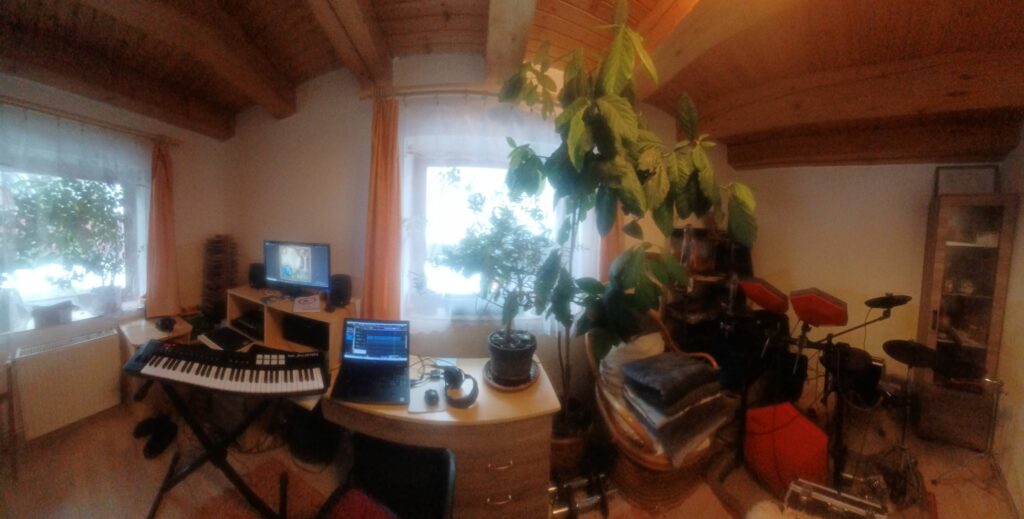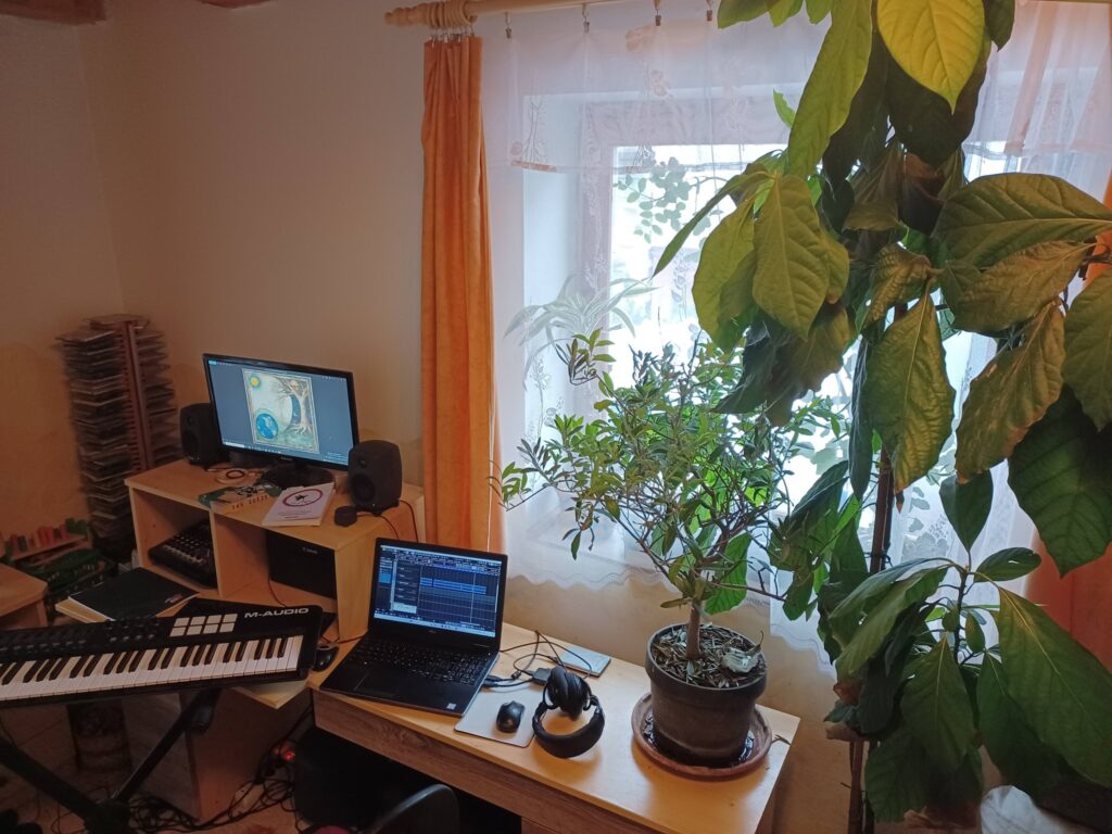 This was the environment – under very humble technical conditions – that the mixes for the PLAN(e)T-based album were born last year. An olive tree, a small avocado plant rescued from the compost (which has since grown into a tree), a Simmons drum kit, a ‘musical trophy’ display cabinet, and a few pieces of furniture – these make up my home office. My tools consisted merely of a Dell laptop that handled the pressure incredibly well, a pair of Genelec speakers connected to a ZEDi10 mixer, and a set of Audio-Technica headphones. I ‘exiled’ myself here during almost every spare minute of the year.